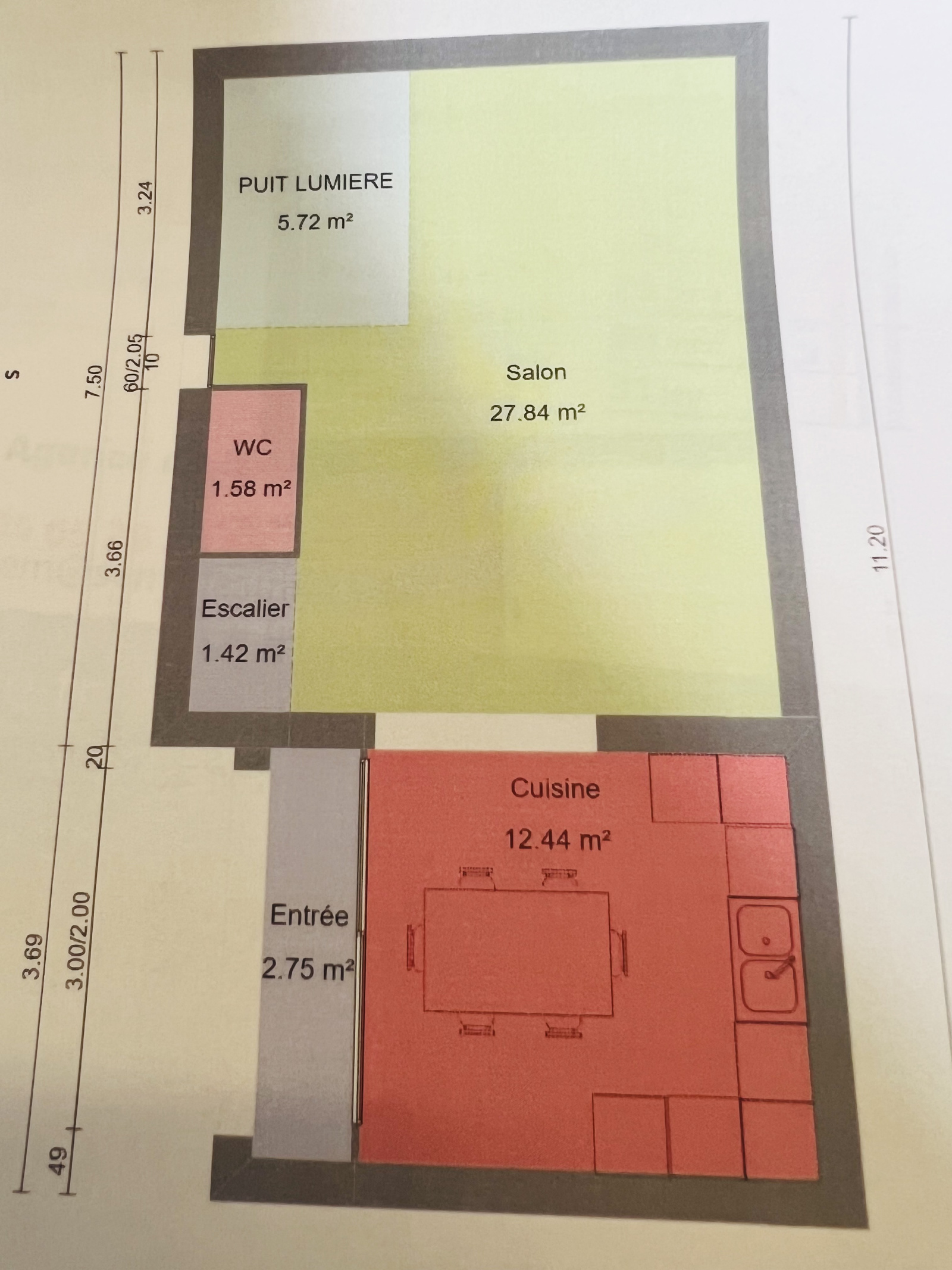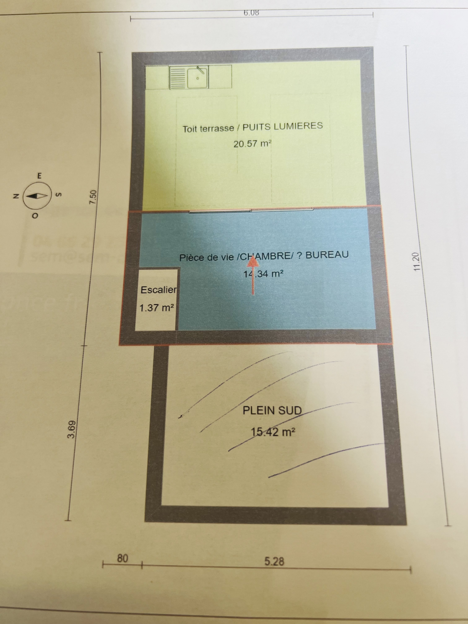Le RDC est en copropriété avec des charges mensuelles de 3 euros, l'étage ne fait pas parti de la copropriété. Ci-joint plan pour un projet d'une maison de Type 4 d'environ 85m² avec toit terrasse de 20.57m² et puit de lumière de 5.72m²